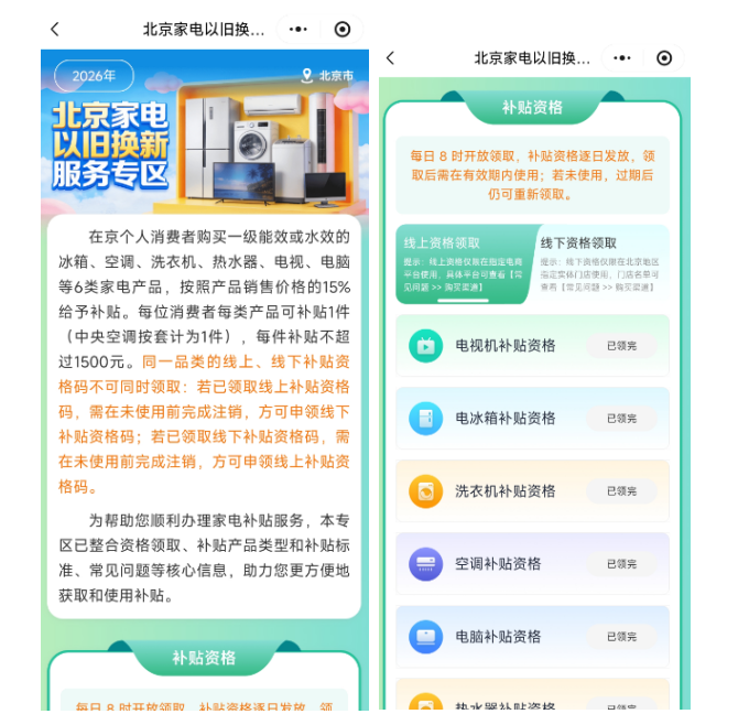 网友们呼吁增加名额,同时研究各类抢国补攻略。根据攻略,消费者可通过京通小程序完成实人认证后,进入“家电、数码以旧换新专区”领取线上或线下补贴资格,并前往政策参与企业线上商城或线下门店购买政策补贴范围内商品。补贴资格每日上午8:00开始发放,领取后须在有效期内使用(当月有效,后期视情调整);逾期未使用补贴资格的,过期后仍可重新领取。